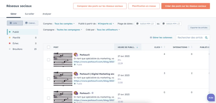 Dans l’onglet “Gérer”, vous allez pouvoir suivre l’ensemble de vos posts sous forme de liste ou de calendrier, avoir une visibilité sur vos posts publiés, planifiés, en échec ou en brouillons.