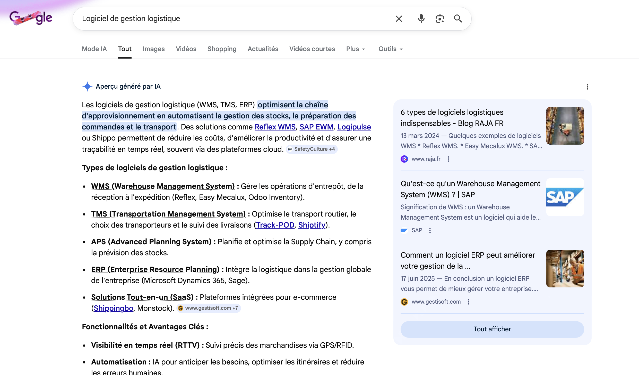 Le vol de l’intention informationnelle : Google répond à la question "Qu’est-ce qu’un logiciel logistique ?" Fin du parcours. L'internaute n'a pas besoin de cliquer sur votre article ou guide pour avoir sa réponse.